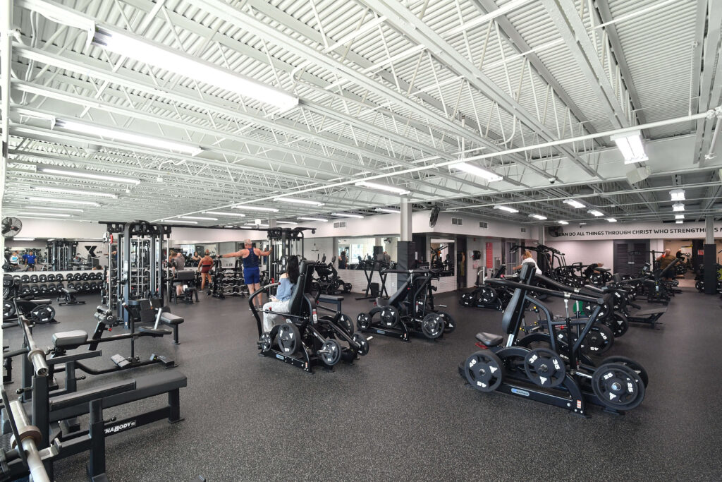Strength and cardio zone including selectorized machines, upright bikes, treadmills, and ellipticals designed to facilitate and cater to various fitness levels and goals.”